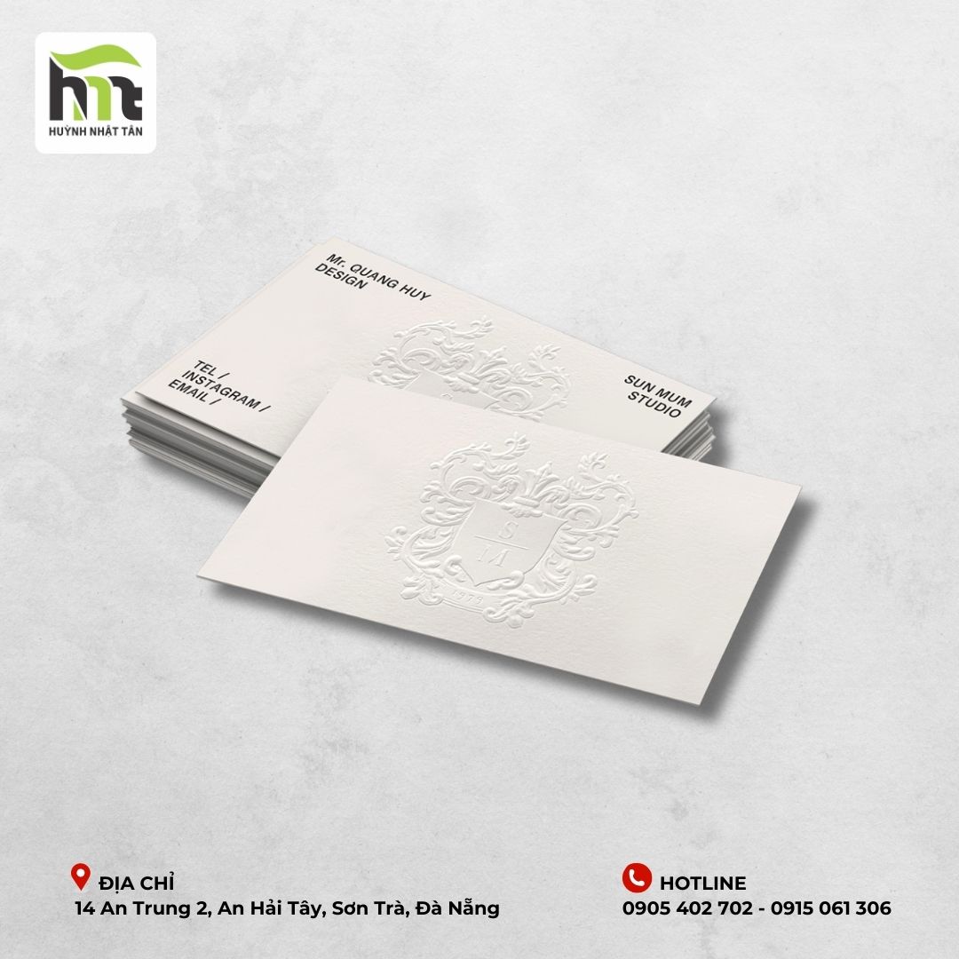 Danh thiếp dập nổi/chìm cao cấp là lựa chọn độc đáo, tăng tính thẩm mỹ và giá trị thương hiệu. Kỹ thuật dập nổi tạo hiệu ứng nâng cao bạt nổi trên bề mặt giấy, trong khi dập chìm tăng chiều sâu và sang trọng cho thiết kế.